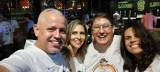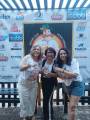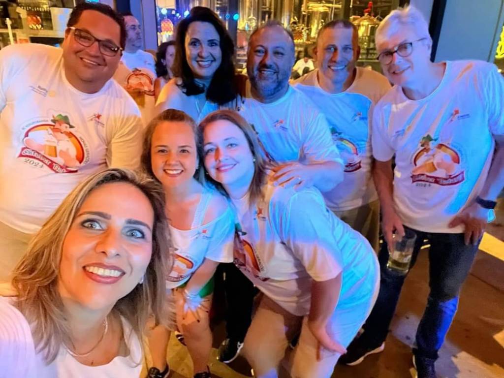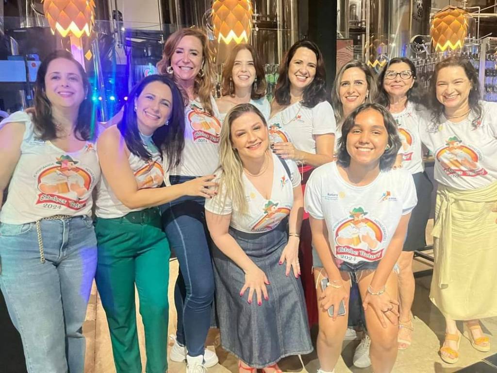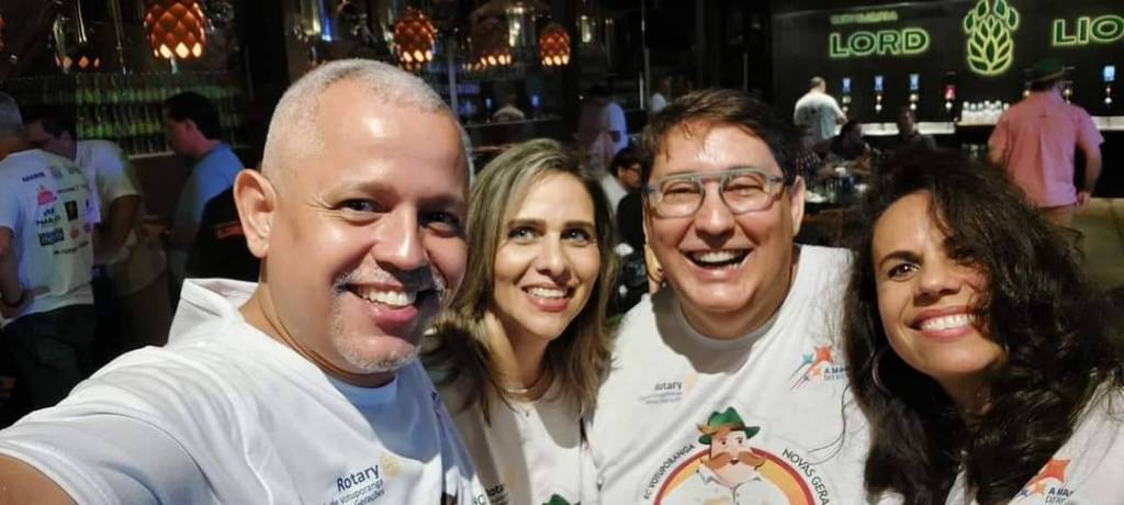 A imagem mostra quatro pessoas posando em frente a um banner promocional de um evento chamado Oktoberfest, organizado pelo Rotary Club de Votuporanga Novas Gerações. As três mulheres e o homem estão usando camisetas brancas com um logotipo colorido no centro, que parece ser do evento Oktoberfest 2023. O homem está no centro, com duas mulheres à sua esquerda e uma à sua direita, todos sorrindo.