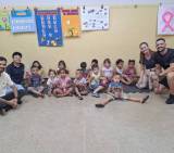 Na parte inferior da imagem, há outra foto de um grupo de crianças sentadas no chão de uma sala, com adultos ao redor. A parede ao fundo tem cartazes coloridos e um laço rosa, que geralmente simboliza a conscientização sobre o câncer de mama.