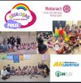 A imagem é uma colagem de várias fotos e logotipos. No canto superior esquerdo, há um logotipo colorido com um arco-íris e nuvens, onde está escrito "CRIANÇAS Creche Rabicó FELIZ". Ao lado direito, está o logotipo do Rotaract com o texto "Rotaract Club de Olímpia Integração".