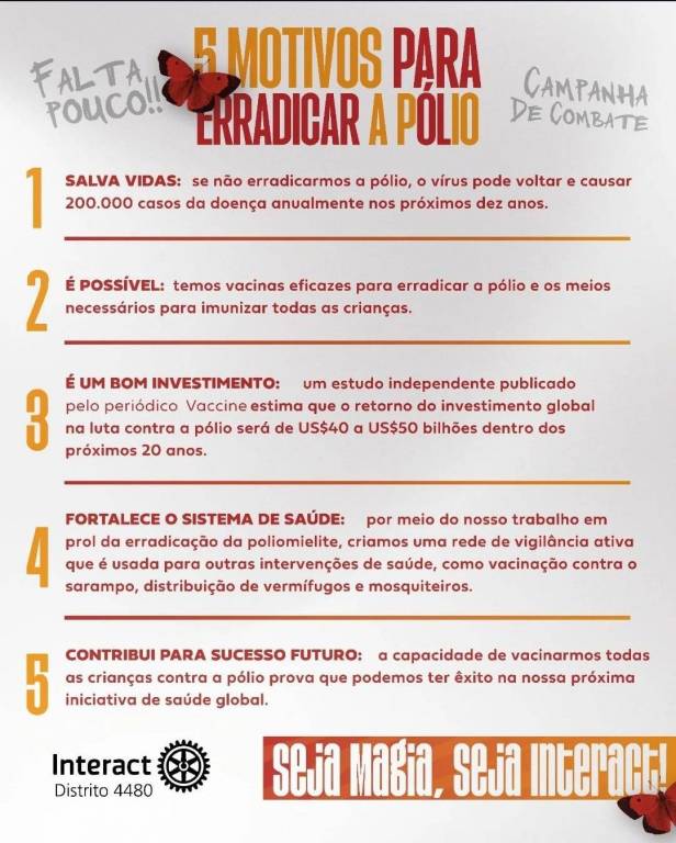 Queridos Interactianos, nós, do Distrito 4480, temos a missão, junto com vocês, de erradicar a paralisia infantil!