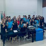A imagem mostra um grupo de cerca de 30 pessoas, a maioria jovens, posando para uma foto em uma sala. Eles estão em pé atrás de uma mesa preta que tem um laptop e alguns equipamentos eletrônicos. Muitas das pessoas estão vestindo camisetas azuis e fazem um gesto com as mãos, levantando o dedo indicador e o polegar, que é um símbolo de apoio à campanha de vacinação contra a poliomielite. À esquerda, há três bandeiras em mastros. No fundo, há um banner do Rotary Club, que menciona "Interact" e "Clube de São José do Rio Preto Palácio das Águas". Este grupo está envolvido em ações de conscientização sobre a importância da vacinação contra a poliomielite e também aborda questões de saúde como a perda auditiva. Todos parecem estar sorrindo e felizes, demonstrando entusiasmo e comprometimento com as causas que apoiam.