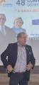 A imagem mostra um homem de meia-idade vestindo um blazer escuro sobre uma camisa listrada de branco e azul, com calças jeans. Ele está em pé, com uma mão no bolso e a outra segurando o cinto. Ao fundo, há uma projeção em uma tela que parece ser de um evento do Rotary. Na projeção, há imagens de um homem e uma mulher, ambos de meia-idade, e alguns textos. O texto visível na projeção inclui "A MAGIA DO ROTARY", "48ª CONFERÊNCIA DISTRITAL", "A MAGIA DE VIVER", "23," e "Eder Boock Casal Gov".