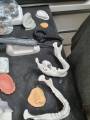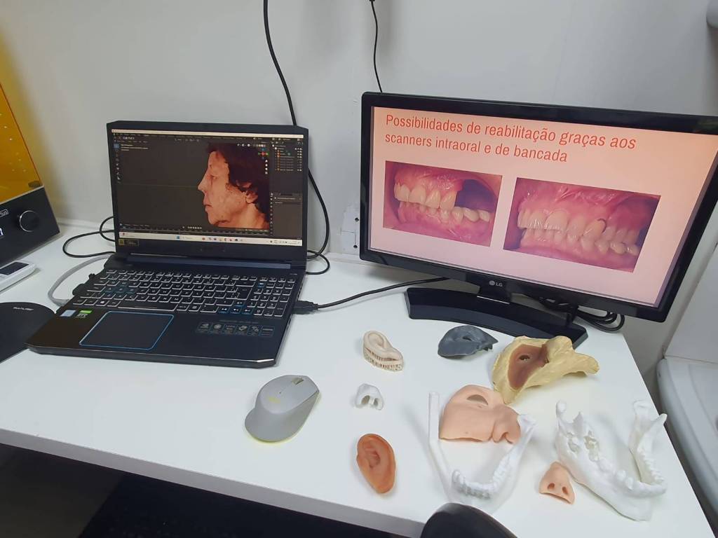 A imagem mostra uma mesa com um laptop e um monitor externo. No laptop, há um software aberto exibindo a imagem de perfil de uma pessoa. No monitor externo, há uma apresentação com o título "Possibilidades de reabilitação graças aos scanners intraoral e de bancada" e duas imagens de dentes. Na mesa, há vários modelos anatômicos, incluindo mandíbulas, orelhas e narizes, que parecem ser feitos de materiais como resina ou plástico. Há também um mouse cinza ao lado do laptop. A cena parece ser de um ambiente de trabalho relacionado à odontologia ou prótese facial.