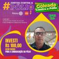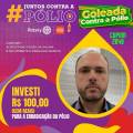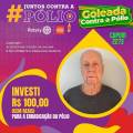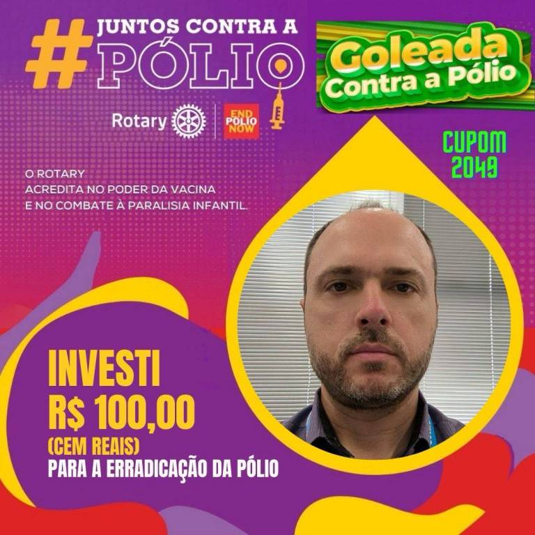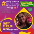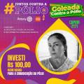 A imagem é um cartaz de campanha contra a pólio. No canto superior esquerdo, está escrito "#Juntos Contra a Pólio" em letras grandes e brancas. Abaixo, há os logotipos do Rotary e da campanha "End Polio Now", junto com a frase "O Rotary acredita no poder da vacina e no combate à paralisia infantil."