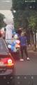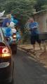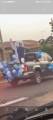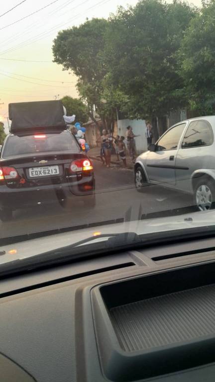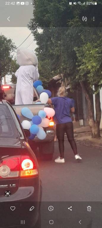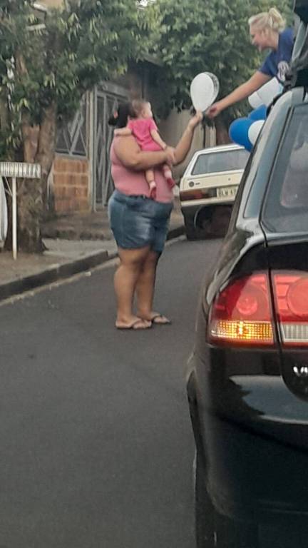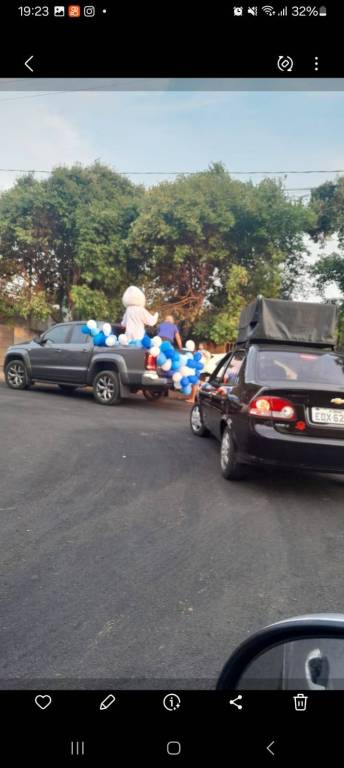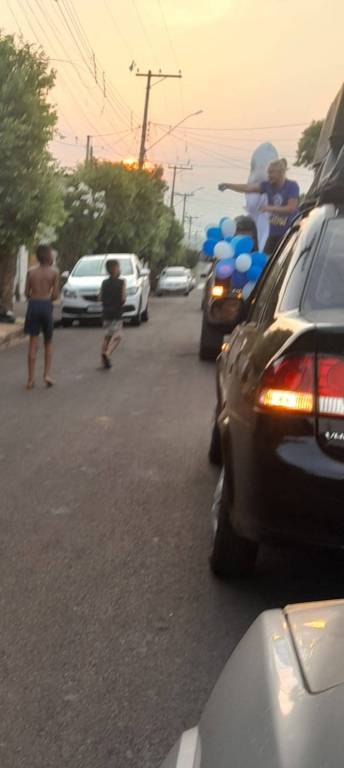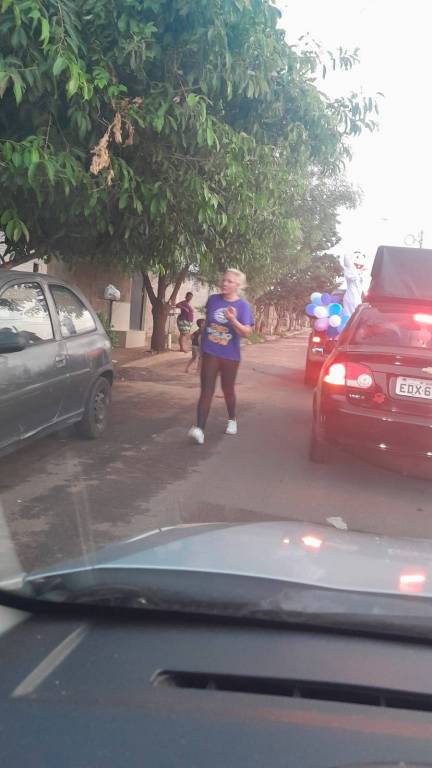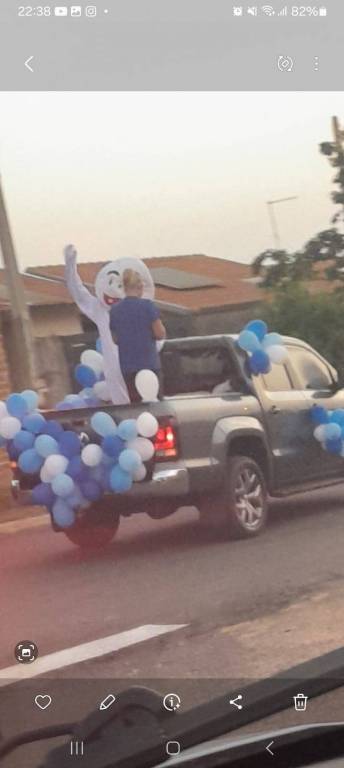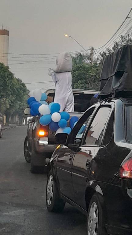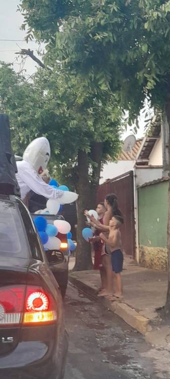 Foto feita de longe por isso a imagem está desfocada. Na carroceria de uma caminhonete toda decorada de bexigas azuis e brancas, temos o personagem do Zé Gotinha acenando para o público. Ao lado dele uma pessoa vestindo camiseta azul está de costas. Observamos casas, postes e árvores no caminho.