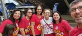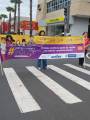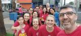 Foto diurna em um cruzamento de via sobre a faixa de pedestre, trás várias pessoas adultas e adolescentes vestidos na grande maioria com a camiseta vermelha da campanha End Pólio Now.
