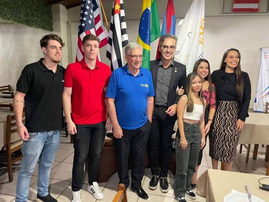 Ao fundo, as bandeiras dos Estados Unidos, do estado de São Paulo e do Brasil, entre outras, estão dispostas lado a lado, reforçando o caráter internacional e multicultural do Rotary Club. A presença dessas bandeiras, juntamente com a disposição das pessoas, sugere um evento formal e significativo para a comunidade local.