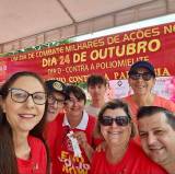 No grupo, algumas pessoas usam óculos escuros e uma delas está com um boné que tem o símbolo do Rotary. Ao fundo, há balões cor-de-rosa, simbolizando o Outubro Rosa, e banners com logotipos de patrocinadores, reforçando a colaboração entre diferentes organizações para promover a conscientização sobre a poliomielite e o câncer de mama. A atmosfera é de união e engajamento comunitário em prol da saúde pública.