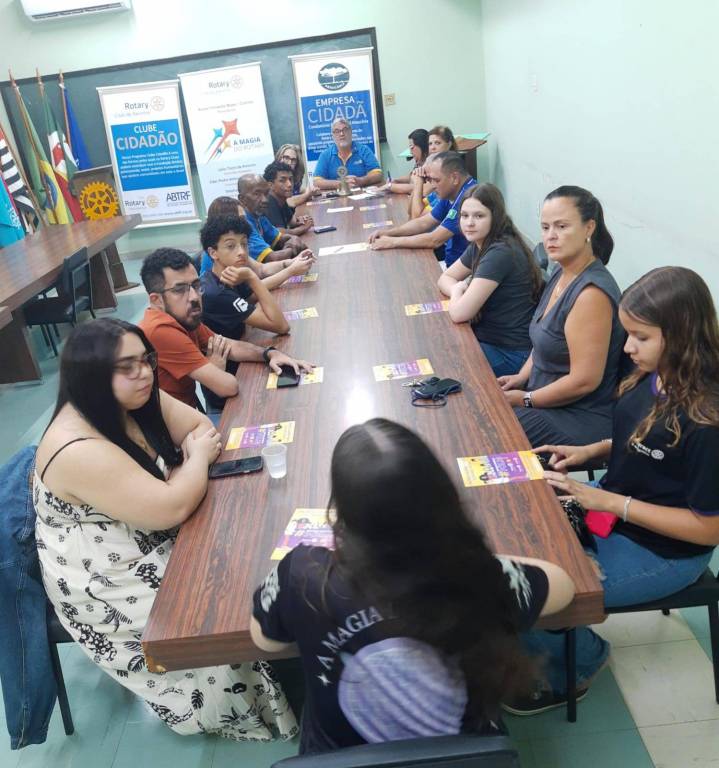 A imagem retrata uma reunião conjunta entre membros do Rotary Club, Rotaract Club e Interact Club de Barretos. Cerca de 14 pessoas estão sentadas ao redor de uma longa mesa retangular de madeira, participando ativamente da discussão. Entre os participantes, há uma mistura de homens e mulheres de diferentes idades, todos focados na reunião.