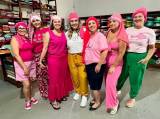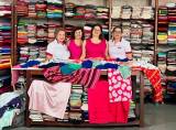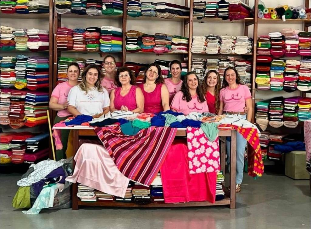 A imagem mostra seis mulheres posando para uma foto em frente a uma mesa coberta com tecidos coloridos. Atrás delas, há prateleiras cheias de tecidos dobrados em várias cores. As duas mulheres no centro estão vestindo blusas rosa, enquanto as outras quatro estão usando camisetas azuis. Todas estão sorrindo e parecem estar em um ambiente de loja ou ateliê de tecidos. A mesa à frente delas está coberta com uma variedade de tecidos de diferentes padrões e cores, incluindo listras e estampas florais.