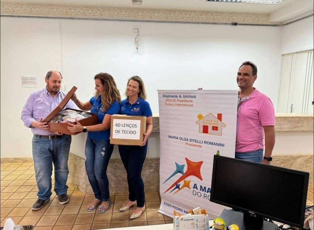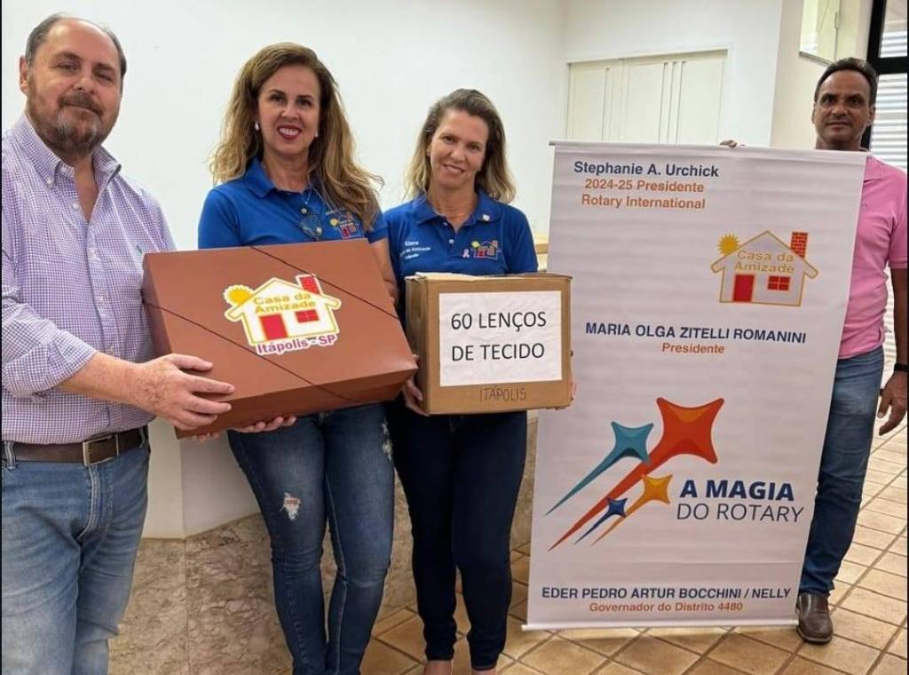 A imagem mostra quatro pessoas posando para uma foto em um ambiente interno com piso de cerâmica. Da esquerda para a direita, o primeiro homem está vestindo uma camisa social listrada de azul e calça jeans, segurando uma caixa marrom com o logotipo "Casa da Amizade Itápolis-SP". Ao lado dele, uma mulher com cabelo castanho claro e longo está vestindo uma camiseta azul com o mesmo logotipo e calça jeans, também segurando uma caixa semelhante. A terceira pessoa, outra mulher, também está vestida com uma camiseta azul e calça jeans, segurando uma caixa de papelão com a inscrição "60 LENÇOS DE TECIDO ITÁPOLIS". Por último, um homem de camiseta rosa e calça jeans está ao lado de um banner. O banner tem o logotipo da "Casa da Amizade" e os seguintes textos: "Stephanie A. Urchick 2024-25 Presidente Rotary International", "Maria Olga Zitelli Romanini Presidente", e "A Magia do Rotary". No rodapé do banner, está escrito "Eder Pedro Artur Bocchini / Nelly".