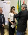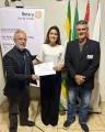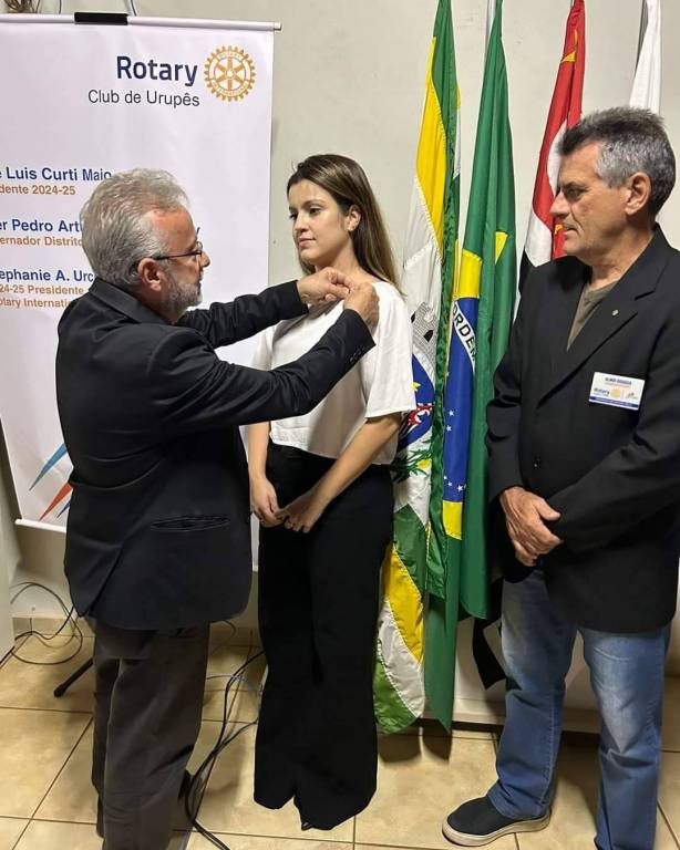 A imagem retrata uma cerimônia de posse no Rotary Club de Urupês. Três pessoas estão posando para a foto. À esquerda, um homem mais velho com barba grisalha e óculos, vestindo um terno preto e camisa escura, está entregando um certificado à mulher no centro. Ela tem cabelos castanhos claros, veste uma blusa branca e calça preta, e está sorrindo enquanto segura o certificado, simbolizando sua posse ou reconhecimento como nova integrante ou em um novo cargo. À direita, um segundo homem, também mais velho, com cabelo grisalho, veste um blazer preto e jeans, e está sorrindo para a câmera, possivelmente um membro do clube.