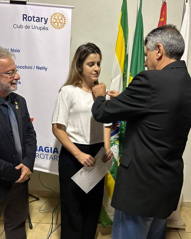 Além do banner, há quatro bandeiras em um suporte, que podem representar o Brasil, o estado de São Paulo, o município de Urupês, e o Rotary International. O certificado que a mulher segura tem o logotipo do Rotary e parece ser um documento oficial de posse ou reconhecimento, embora o texto específico não esteja totalmente legível na imagem.