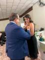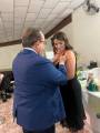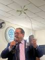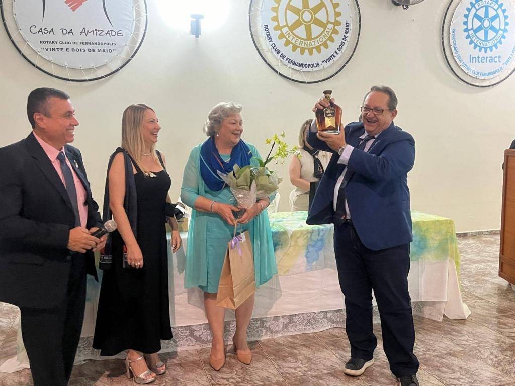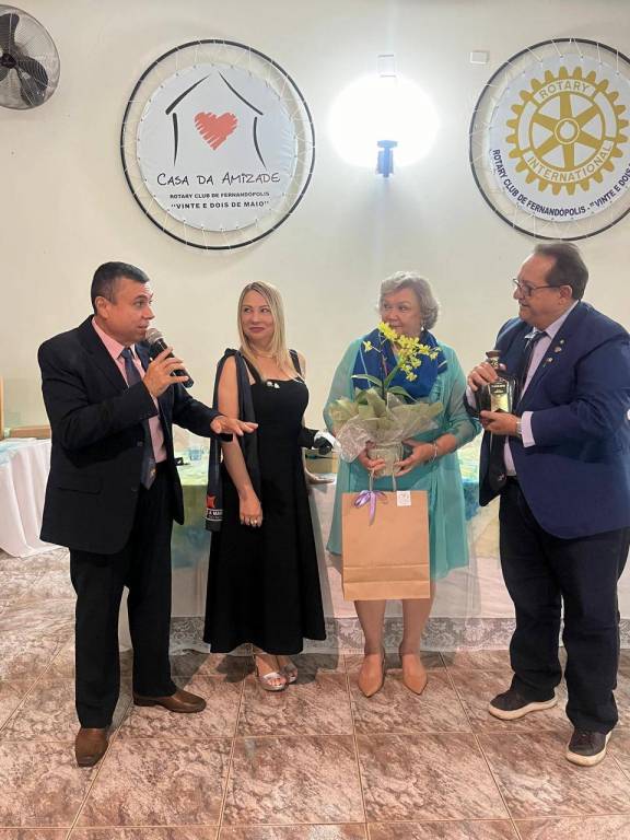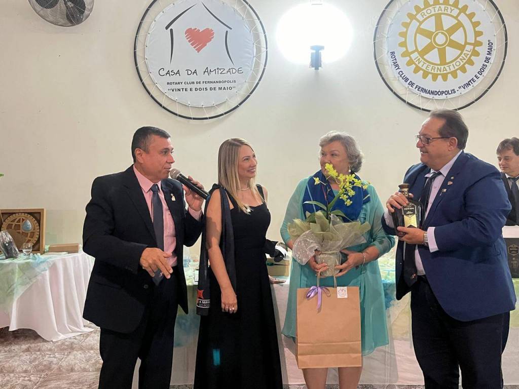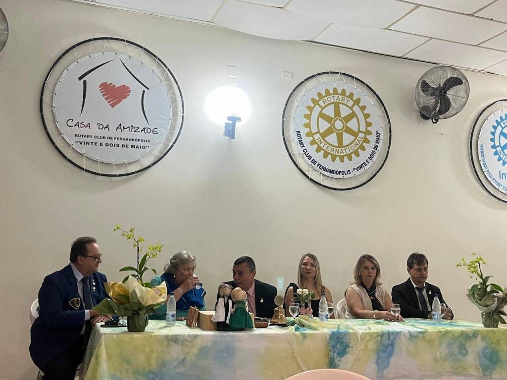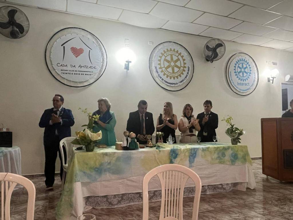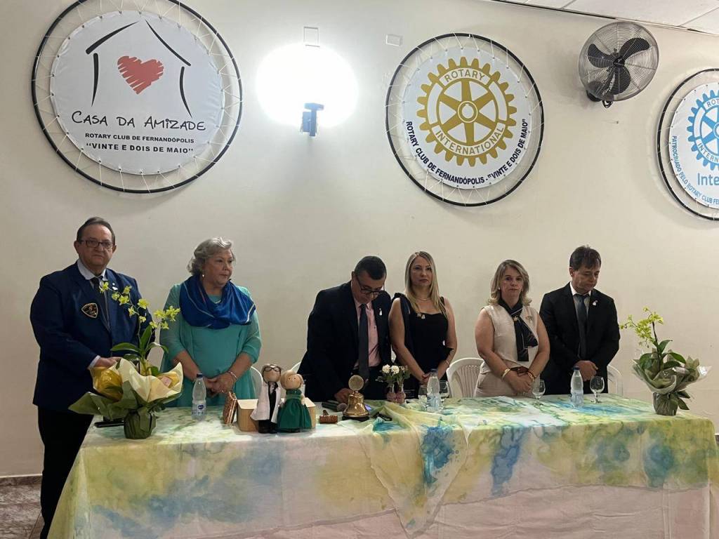 Foto de três casais elegantemente vestidos sendo que o casal da esquerda é nosso Gov do Distrito 4480 Éder Bocchini e esposa Nelly, todos posicionados de pé atrás de uma mesa retangular com toalha fundo branco manchada de azul e amarelo. Sobre a mesa alguns artefatos: vasos de flores, sino e martelo rotários, copos, garrafas d’água, casal de bonecos de pano representando o casal Gov., etc. O homem que está no centro da mesa faz um pronunciamento com um microfone na mão esquerda. Atrás deles numa parede clara da esquerda para a direita uma esfera com o símbolo da Casa da Amizade Rotary Club de Fernandópolis “ Vinte e Dois de Maio “, uma luminária acesa, outra esfera com a roda Rotária grande com a inscrição abaixo: Rotary Club de Fernandópolis “Vinte e Dois de Maio”, um ventilador preto de teto e finalizando uma esfera com o símbolo do Interact - patrocinado pelo Rotary Club de Fernandópolis “ Vinte e Dois de Maio. À frente observamos parte de uma cadeira plástica.