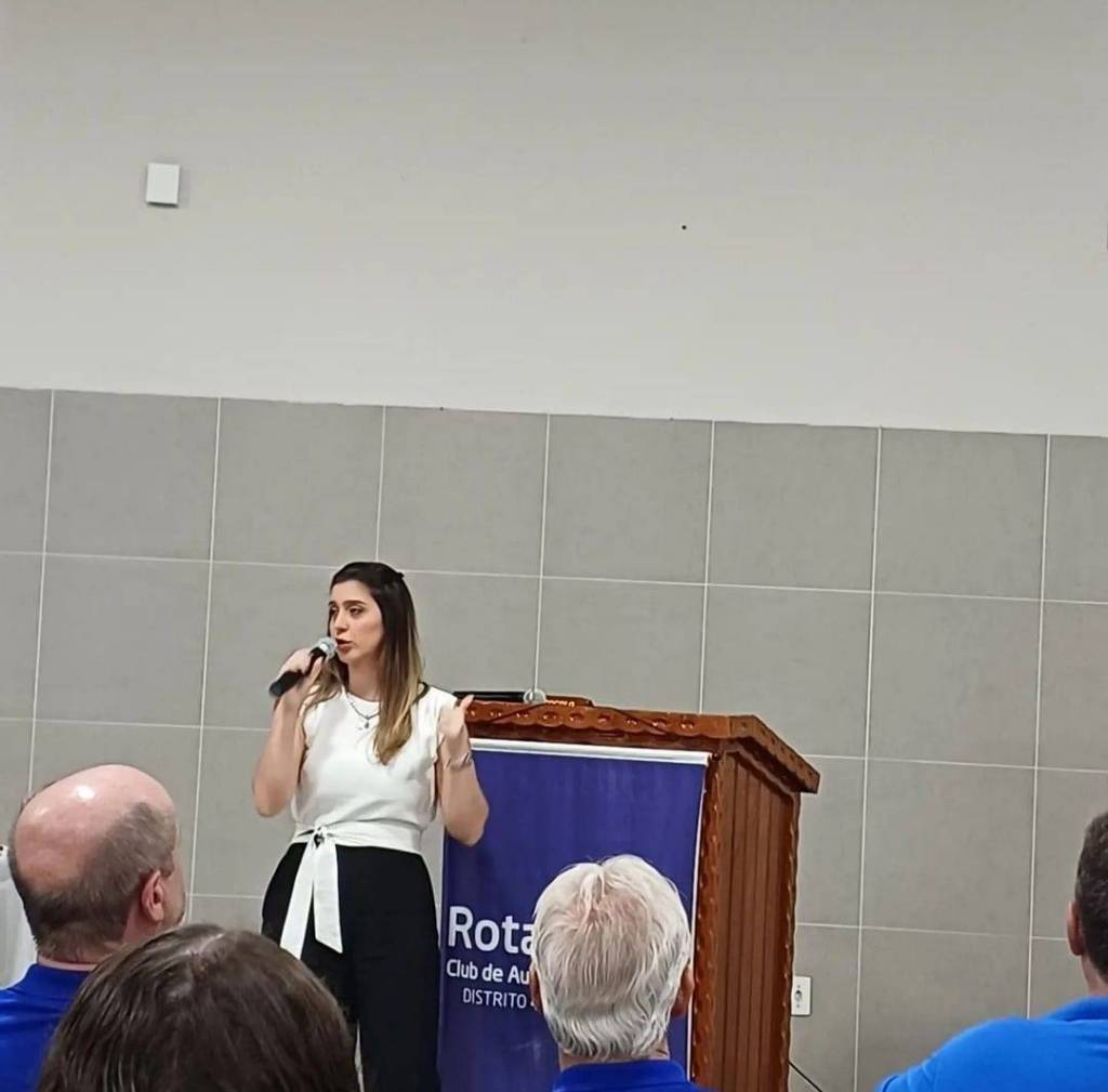 A imagem mostra uma cerimônia de entrega de certificado em um evento do Rotary Club. No centro da imagem, uma mulher jovem, sorridente, está segurando um certificado ao lado de um homem mais velho, também sorridente. Ambos estão em pé. A mulher veste uma blusa branca e calça preta, enquanto o homem veste uma camisa polo azul e calça jeans. Atrás deles, há um homem mais velho, de cabelos brancos, em pé atrás de um púlpito de madeira, também vestindo uma camisa polo azul. À esquerda, uma mulher idosa está sentada a uma mesa coberta com uma toalha branca, aplaudindo. Na parede ao fundo, há um banner azul com o logotipo do Rotary International e outro banner com o nome "Rotary Club de Auriflama" e o número "Distrito 4480".