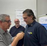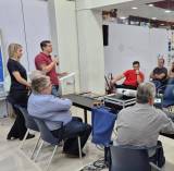 A imagem mostra uma sala de conferência ou reunião, onde várias pessoas estão reunidas. No centro, um homem de camiseta vermelha está em pé, segurando um microfone e falando para o grupo. Ao lado dele, uma mulher loira está de pé, observando. Sentados ao redor de uma mesa preta, há outros participantes, incluindo um homem de camisa azul claro e outro de camisa listrada. Na mesa, há um projetor e alguns equipamentos eletrônicos. Ao fundo, algumas pessoas estão sentadas, incluindo um homem de camiseta vermelha e outro de camiseta cinza, ambos observando a apresentação. A sala tem paredes brancas e um ambiente bem iluminado.