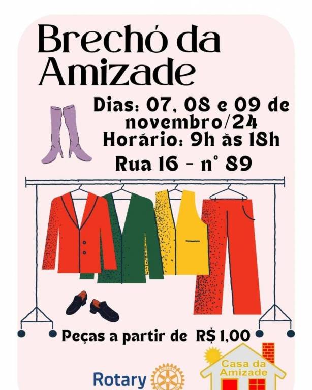 Há ilustrações de roupas penduradas em cabides, incluindo um casaco vermelho, um casaco verde, uma peça amarela e uma calça vermelha. Também há um par de botas roxas e um par de sapatos pretos. Na parte inferior, há os logotipos do Rotary e da Casa da Amizade.