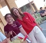 Na imagem, há duas mulheres sorrindo para a câmera. A mulher à esquerda é mais jovem, tem cabelo castanho escuro preso e está vestindo uma camiseta bordô com detalhes brancos nas mangas. Ela segura uma cesta de palha com papéis coloridos dentro. A mulher à direita é mais velha, tem cabelo castanho claro e veste uma blusa vermelha com calças brancas. Ambas estão em um ambiente ao ar livre, com plantas ao fundo e uma pessoa sentada em uma cadeira à direita, usando uma camiseta escura e shorts.