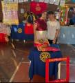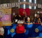 A imagem mostra uma barraca de vendas em um evento, provavelmente uma feira ou festival. Há várias pessoas trabalhando atrás do balcão, todas vestindo uniformes com camisetas pretas e amarelas e toucas de proteção. Na frente da barraca, há uma faixa azul com o logotipo do Rotary Club e um avental vermelho pendurado com a inscrição "END POLIO NOW".