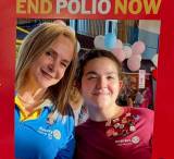 À esquerda, há um banner com a imagem de crianças e a mensagem "Quem ama vacina" e "Juntos contra a #Polio", promovendo a vacinação contra a poliomielite. O banner também menciona o Rotary, Rotaract e Interact, e inclui o texto "O Rotary acredita no poder da vacina e no combate à paralisia infantil" com um site listado na parte inferior.