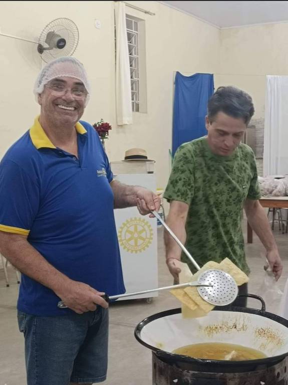 A imagem mostra duas pessoas em uma cozinha. O homem à esquerda está sorrindo e usando uma touca de cabelo, óculos e uma camisa polo azul com detalhes amarelos. Ele está segurando uma escumadeira grande e parece estar fritando algo em uma panela grande com óleo. O homem à direita está usando uma camiseta verde com estampa e está olhando para a panela. Ao fundo, há uma parede com uma janela, uma cortina branca e um ventilador de parede. Também é possível ver um banner com o logotipo do Rotary Club.