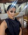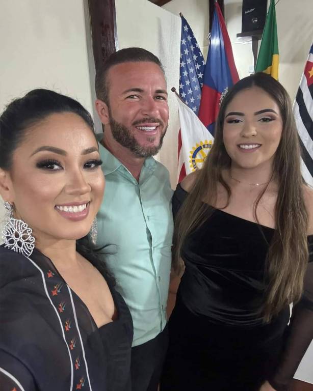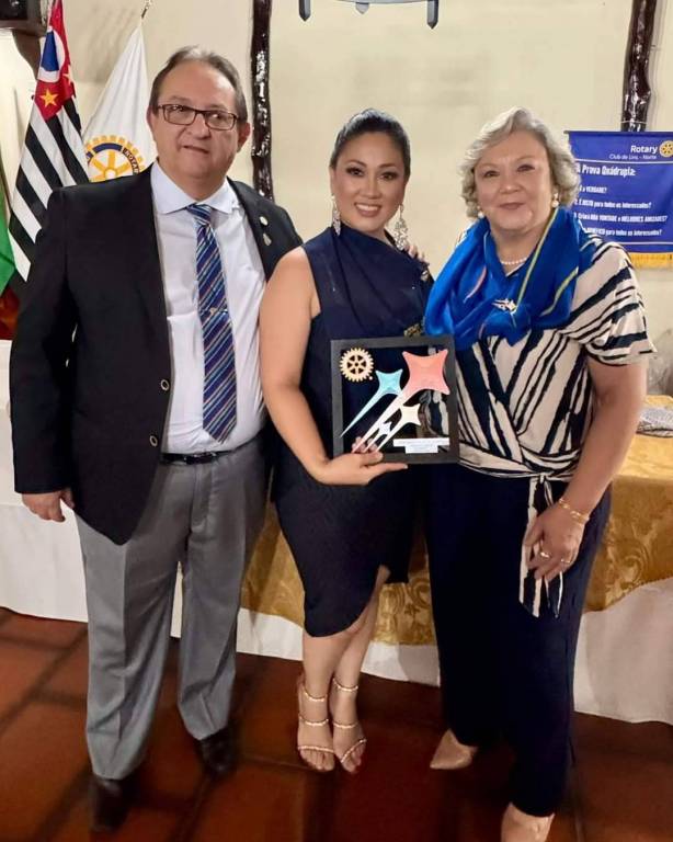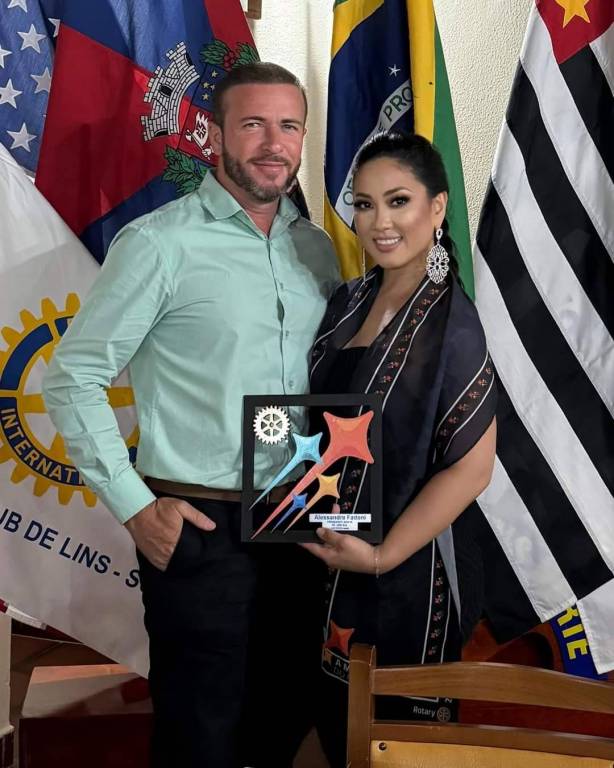 A imagem mostra uma mulher sorridente segurando um troféu. Ela tem cabelo escuro preso em um coque e usa brincos grandes e decorativos. Está vestida com um vestido preto e um xale ou echarpe com detalhes em laranja. O troféu que ela segura tem o logotipo do Rotary International no canto superior esquerdo e três formas coloridas (azul, laranja e amarelo) que parecem estrelas ou cometas. Na parte inferior do troféu, há uma placa com o nome "Alessandra Fadoni". Ao fundo, há bandeiras, incluindo a bandeira do Brasil e outra com o logotipo do Rotary.
