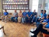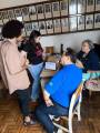 A imagem mostra um grupo de quatro pessoas em uma sala. Duas pessoas estão em pé e duas estão sentadas ao redor de uma mesa. A pessoa à esquerda, em pé, é um homem com cabelo cacheado e está vestindo uma camisa bege. Ao lado dele, também em pé, está uma mulher de cabelos longos e escuros, usando uma camiseta preta com texto em rosa. Na mesa, há um tablet ou laptop com algo exibido na tela, mas não é possível ler o conteúdo. Sentado à direita, um homem de camisa azul com um pequeno emblema da bandeira do Brasil na manga está olhando para a tela. Ao lado dele, uma mulher de cabelos grisalhos está sentada, vestindo uma blusa escura. Ao fundo, há uma parede coberta com retratos emoldurados de várias pessoas, provavelmente figuras históricas ou importantes para o local. O chão é de tacos de madeira.