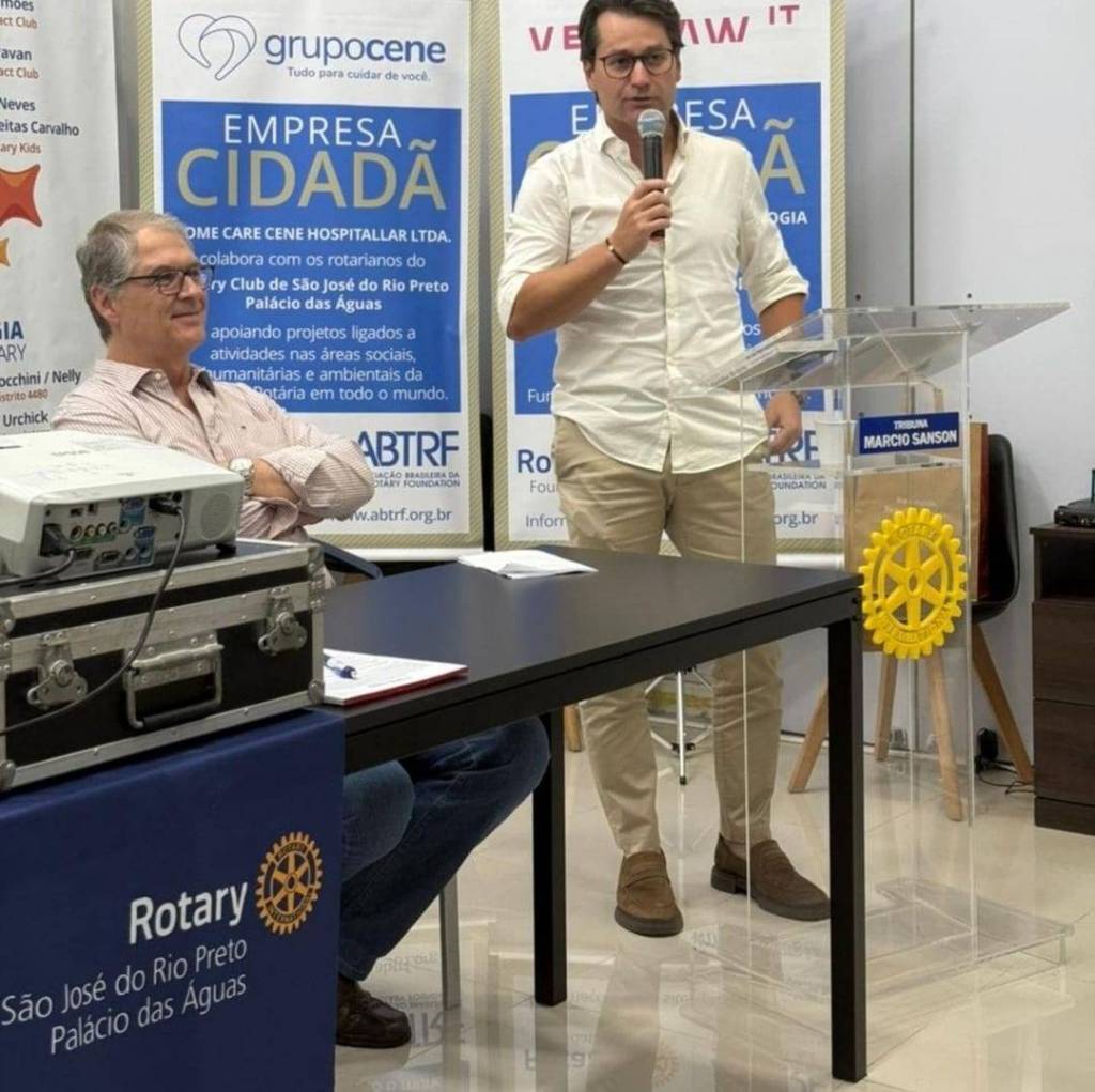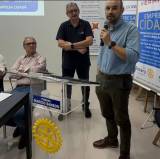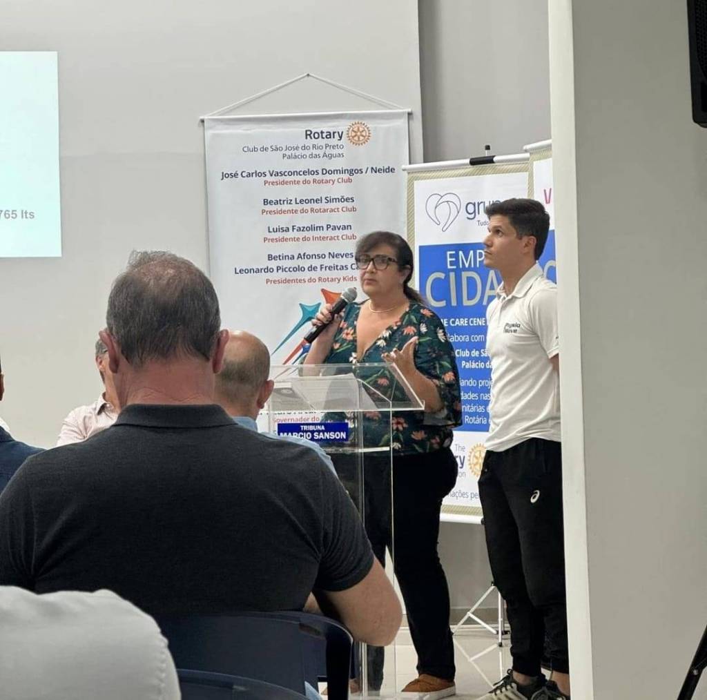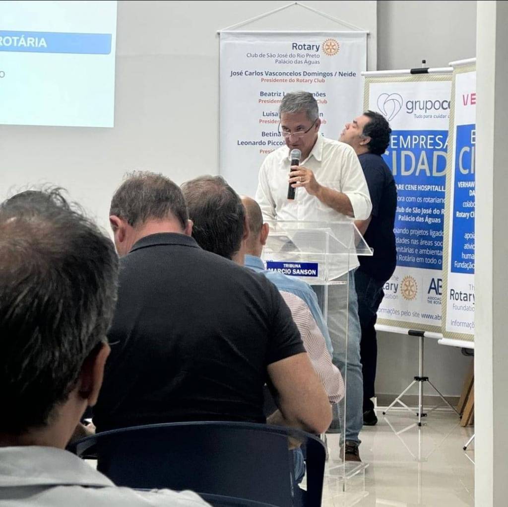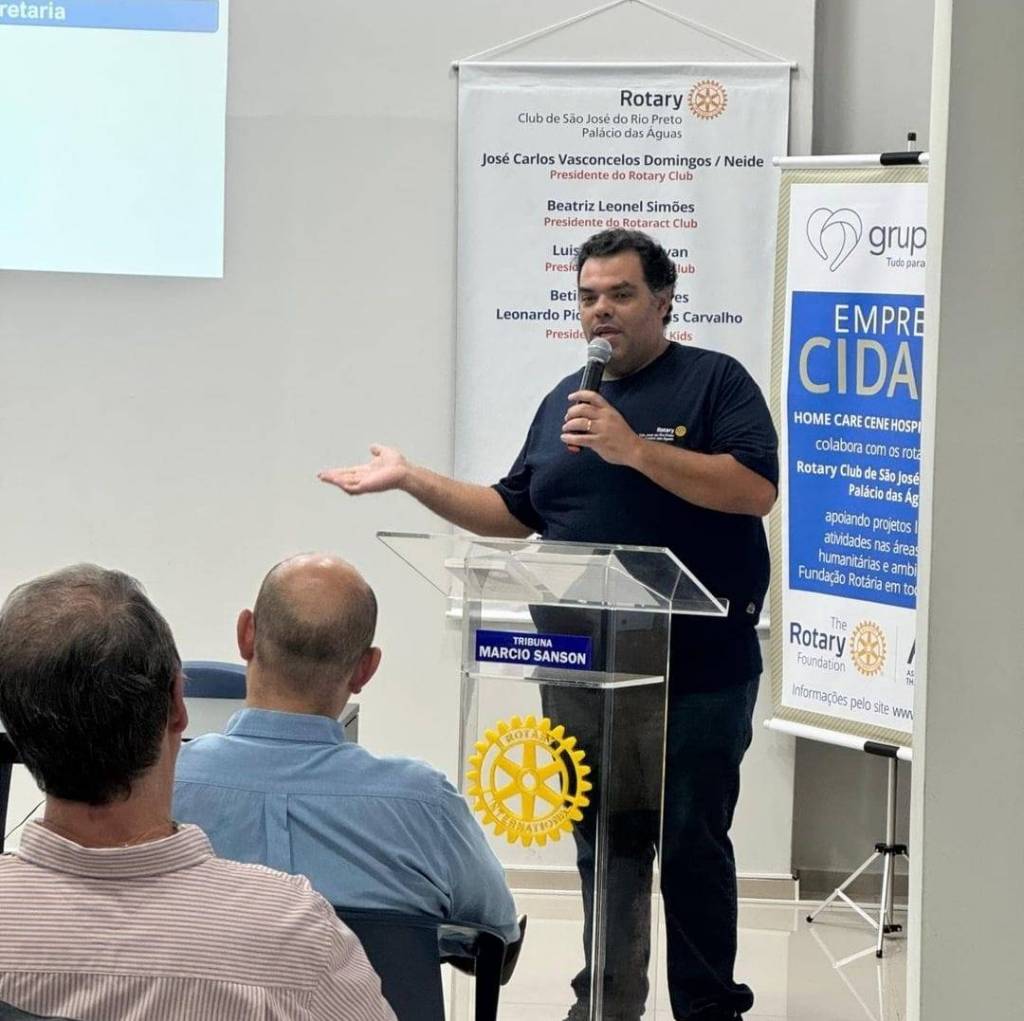 A imagem mostra uma reunião em uma sala, onde várias pessoas estão sentadas em cadeiras azuis, voltadas para a frente, onde há uma mesa com três homens sentados e um homem em pé, aparentemente falando para o grupo. Na parede ao fundo, há banners e um projetor que exibe informações. Algumas pessoas na audiência estão vestindo camisetas com o logotipo do Rotary Club. O ambiente parece ser um espaço de conferência ou reunião, com um clima formal e organizado.