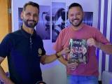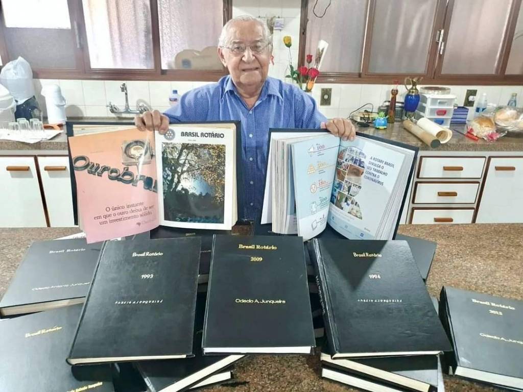 Ele segura em cada uma das mãos pastas abertas mostrando exemplares de revistas rotárias catalogadas nas mesmas.