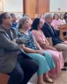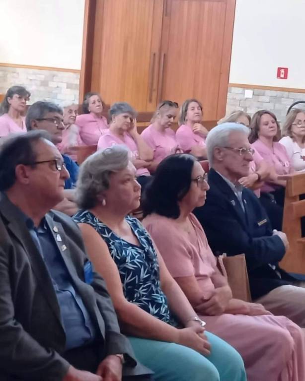 A imagem mostra um grupo de pessoas sentadas em um ambiente que parece ser uma igreja ou um local semelhante, com bancos de madeira. Os indivíduos estão vestidos de maneira mista, com roupas formais e casuais. Algumas pessoas estão vestindo camisas rosas, o que pode indicar um grupo ou evento coordenado. Ao fundo, há portas de madeira e um extintor de incêndio montado na parede.