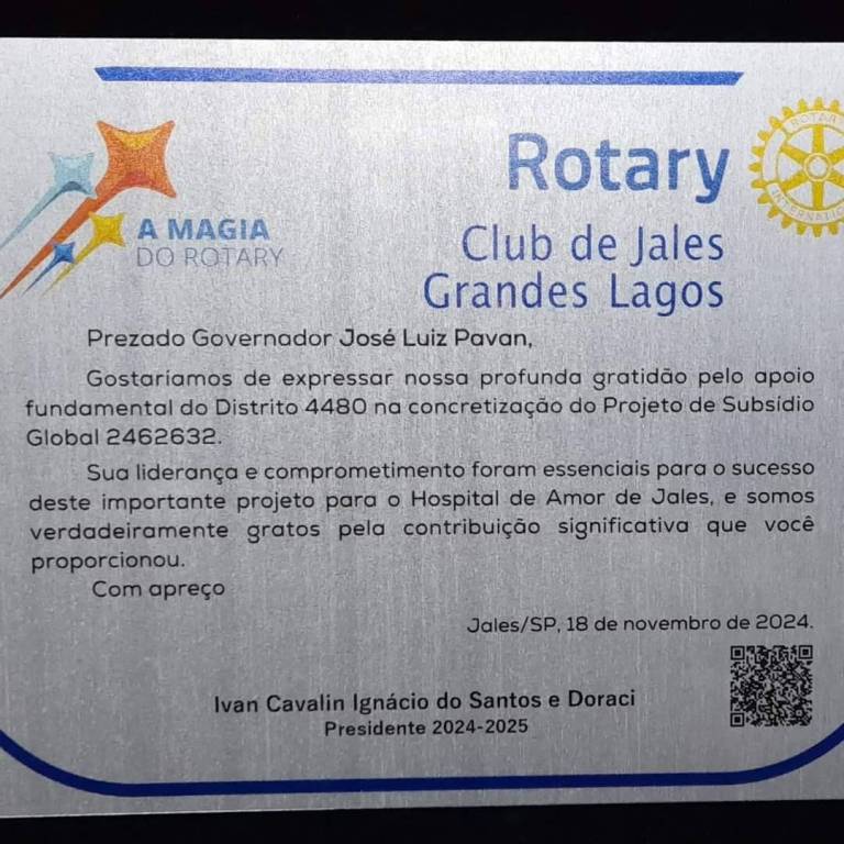 O projeto de Subsídio Global foi realizado pelo Rotary Club de Jales - Grandes Lagos, juntamente com a AVCC.