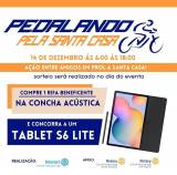 O cartaz é um anúncio de um evento chamado "Pedalando pela Santa Casa". O evento ocorrerá no dia 14 de dezembro, das 6:00 às 18:00. É uma ação entre amigos em prol da Santa Casa, e haverá um sorteio realizado no dia do evento. O cartaz convida as pessoas a comprarem uma rifa beneficente na Concha Acústica, com a chance de concorrer a um Tablet S6 Lite. Na parte inferior do cartaz, há menção à realização pelo Interact Club de Votuporanga e apoio do Rotary Club de Votuporanga Novas Gerações e Rotary Club de Votuporanga 8 de Agosto. Há também a imagem de um tablet ao lado do texto.