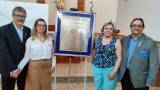 A imagem mostra um evento formal do Rotary Club de Jales, onde três pessoas estão participando de uma cerimônia de entrega de um projeto de equipamentos hospitalares para um hospital em Jales. As pessoas estão segurando um tecido vermelho, prestes a revelar uma placa ou quadro, simbolizando a inauguração ou apresentação oficial do projeto. O ambiente é um espaço comunitário, com uma atmosfera de celebração e compromisso com a comunidade.
