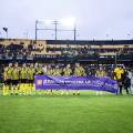 Atrás dos jogadores, vê-se a arquibancada do estádio, que está parcialmente ocupada por torcedores. As cores predominantes nas arquibancadas são preto e amarelo, refletindo as cores do time. O céu está nublado, e as luzes do estádio estão acesas, indicando que o tempo está nublado ou que o evento pode estar ocorrendo no final da tarde ou início da noite. A atmosfera parece ser de apoio a uma causa social, além do evento esportivo em si.
