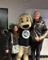 A imagem mostra três pessoas posando para uma foto em um ambiente interno. No centro, há uma pessoa vestida com uma fantasia de cachorro. A fantasia é de cor bege, com grandes orelhas caídas e um focinho preto. Os olhos são grandes e expressivos, com sobrancelhas pretas que dão uma aparência amigável. A fantasia está usando uma camiseta preta com um logotipo circular no peito. O logotipo tem as palavras "Pet Valu" no centro, em letras brancas, e ao redor estão as palavras "Dunnville", "Love Live", e "Rescue" em um círculo.