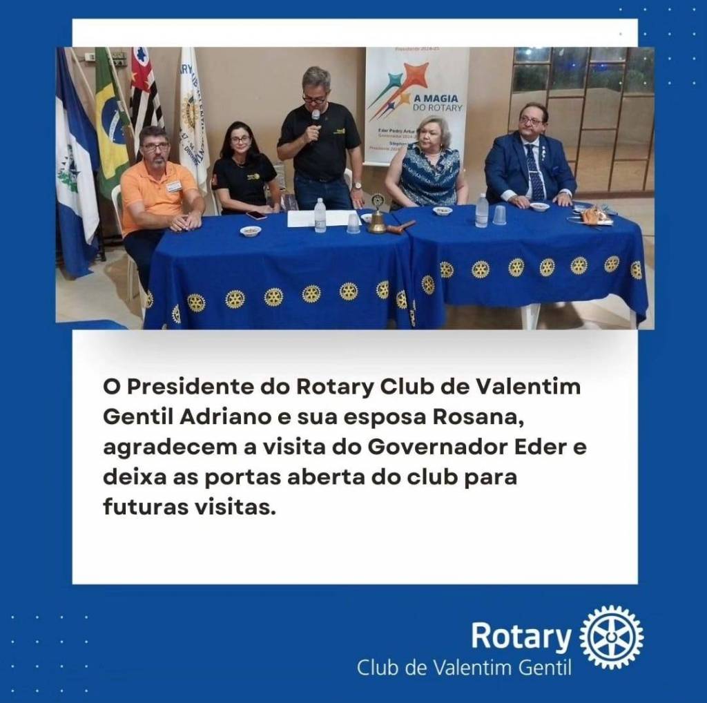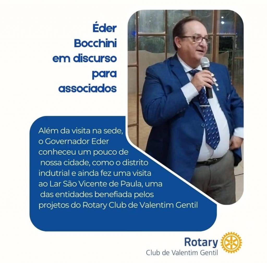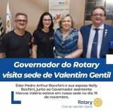 Na parte inferior da imagem, há um texto em um fundo azul que diz: "Governador do Rotary visita sede de Valentim Gentil". Abaixo, em um fundo branco, está escrito: "Éder Pedro Arthur Bocchini e sua esposa Nelly Bochni, junto ao Governador assistente Marcos Valério esteve em nossa sede no dia 19 de novembro." No canto inferior direito, está o logotipo do Rotary e o texto "Club de Valentim Gentil".
