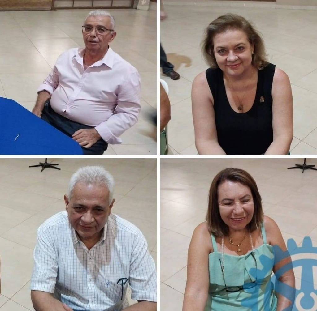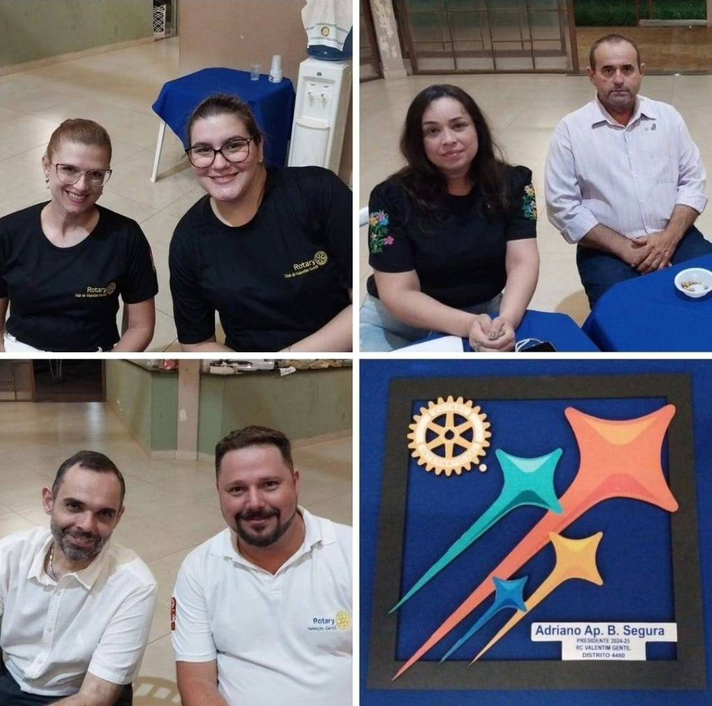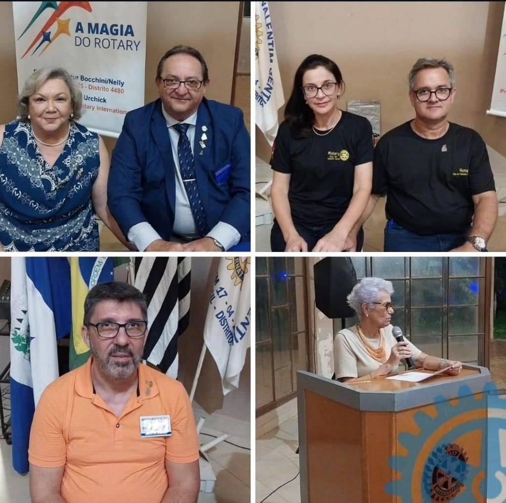 A imagem mostra quatro pessoas posando para uma foto. À esquerda, há um homem de óculos e camiseta preta com o logotipo do Rotary. Ao lado dele, está uma mulher de cabelo escuro e óculos, também vestindo uma camiseta preta com o logotipo do Rotary. A terceira pessoa é uma mulher de cabelo grisalho, vestindo um vestido azul com detalhes em branco. À direita, há um homem de óculos, vestindo um terno azul e gravata azul com detalhes brancos. Atrás deles, há uma bandeira do Rotary e um banner que diz "Rotary Club de Valentim Gentil".