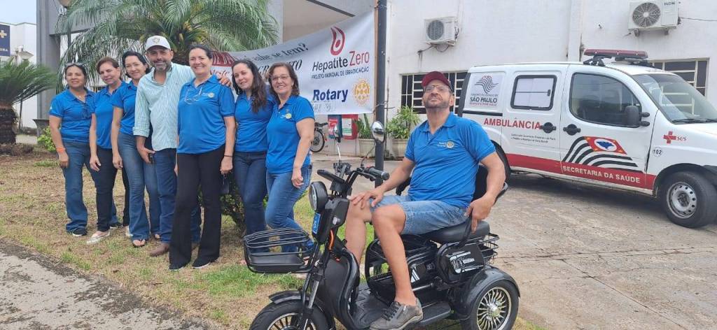 A imagem mostra um grupo de sete pessoas posando para uma foto ao ar livre, em frente a um prédio. Seis delas estão em pé, lado a lado, e vestem camisetas azuis com o logotipo do Rotary no peito. Uma das pessoas, um homem, está usando uma camisa verde clara e um boné branco. Ao lado do grupo, há um homem sentado em um triciclo elétrico preto, também vestindo uma camiseta azul com o logotipo do Rotary e um boné vermelho. Ele está usando óculos e shorts jeans.