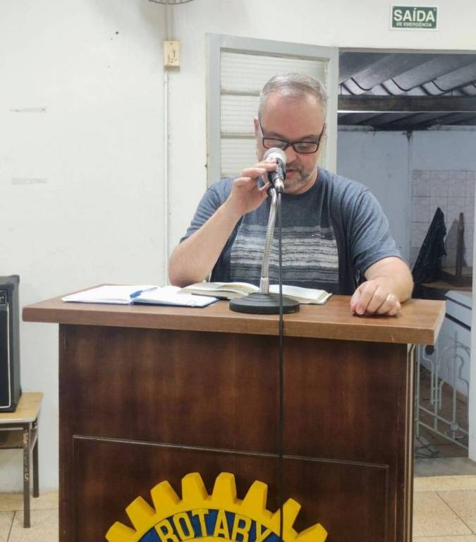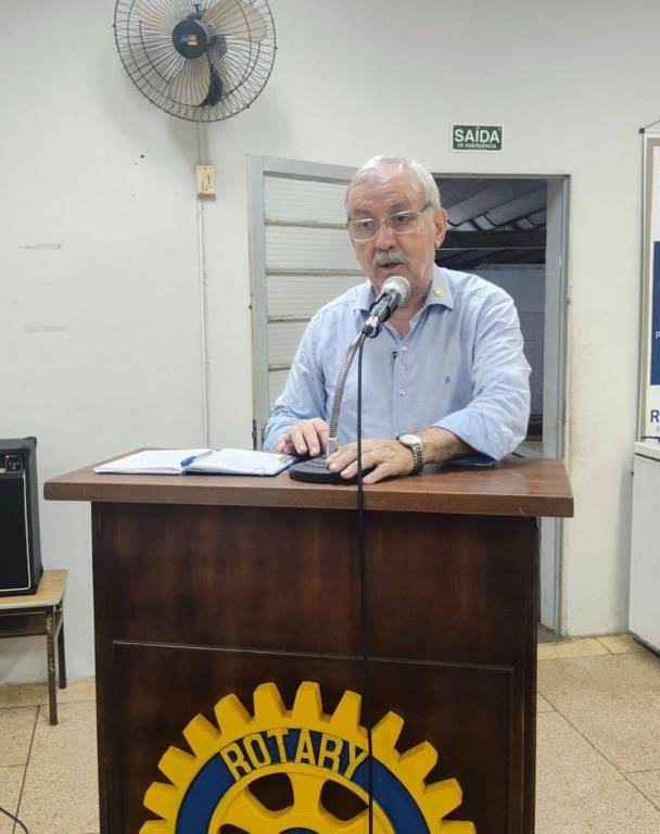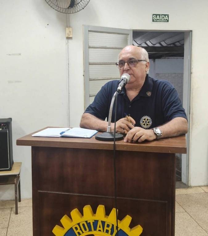 A imagem apresenta uma mulher de meia-idade com cabelos grisalhos e curtos, penteados para o lado. Ela usa óculos de armação preta e está vestida com uma camisa polo azul escura que exibe o logotipo do Rotary Club, um emblema circular com uma roda dentada amarela e azul, no lado esquerdo do peito. A mulher está em pé atrás de um púlpito de madeira escura, que possui o mesmo logotipo do Rotary Club na parte frontal.