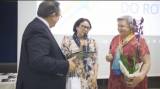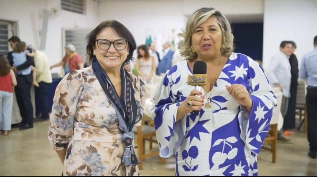 Foto com duas mulheres em primeiro plano: a da esquerda está sorrindo, tem cabelos pretos curtos, usa óculos, está de vestido estampado claro e tem um echarpe no pescoço; a da direta é loira de cabelos nos ombros, usa vestido estampado de branco e azul e segura na mão direita um microfone que aparentemente está capitando suas palavras. Atrás delas várias pessoas em movimento num salão fechado com paredes brancas e ao fundo um pavilhão com suas bandeiras.
