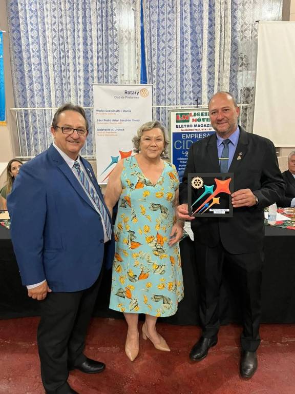 Foto do casal Gov. do Distrito Éder Bocchini e Nelly; ele vestindo calça preta, camisa clara com gravata e blazer azul, ela de vestido estampado; acompanhados de um homem calvo vestindo terno escuro, camisa azul e gravata e segurando um quadro escuro de madeira vazado com a logo colorida da gestão atual A Magia do Rotary.