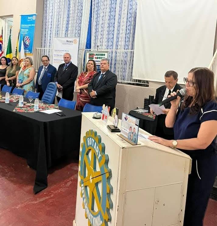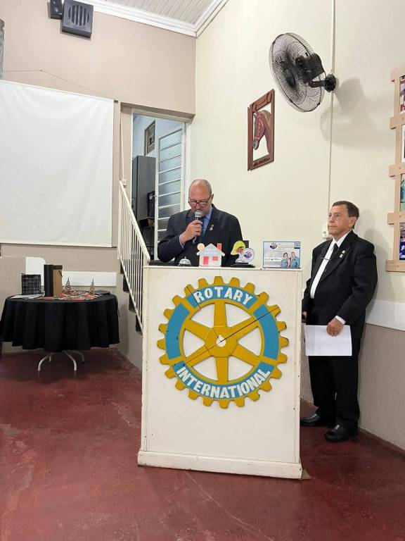 Atrás deles uma mesa retangular grande com toalha escura e pessoas sentadas apoiadas na mesma. Ao fundo cortinas brancas de renda com forro azul trás a sua frente dois banners: um do Rotary Club de Pindorama e o outro de Empresa Cidadã. O lugar está iluminado e o piso é escuro.