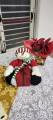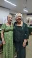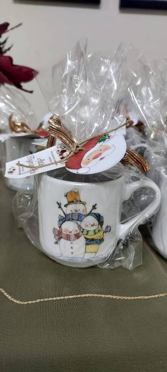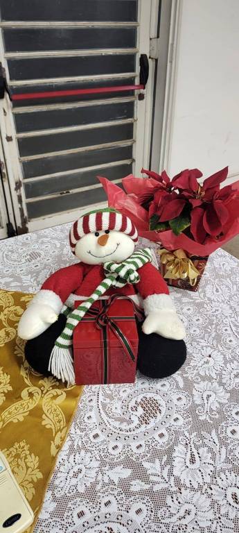 A mesa tem toalhas verdes com vasinhos de plantas vermelhas características do Natal bem como outros objetos sobre ela. Cadeiras de madeira com capas brancas estão posicionadas junto à mesa.