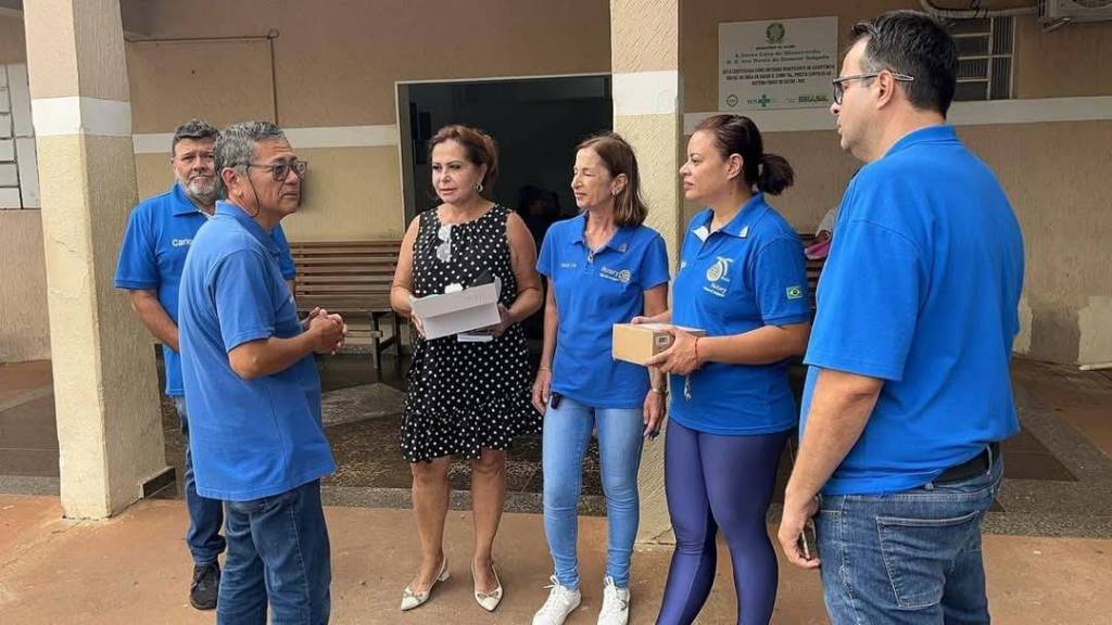 A imagem mostra um grupo de seis pessoas em pé na frente de um prédio com uma placa que diz "Santa Casa de Misericórdia". Os indivíduos estão vestindo camisas azuis, exceto uma pessoa no centro que está vestindo um vestido preto com bolinhas brancas. A pessoa no centro está segurando uma caixa com alguns itens dentro, que está sendo entregue por uma das pessoas de camisa azul. O prédio parece ser uma instituição de saúde ou caridade, como sugerido pelo nome "Santa Casa de Misericórdia", que se traduz para "Santa Casa de Misericórdia".